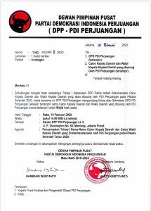 Sementara itu dari informasi yang dihimpun media ini, melalui surat undangan DPP PDIP bernomor 1196 tertanggal 18 Februari 2020, untuk 1 pasangan calon Gubernur dan Wakil Gubernur yang akan diusung dan telah ditetapkan oleh Ketua Umum PDIP yaitu pasangan petahana Olly Dondokambey Dan Steven Kandow dari Provinsi Sulawesi Utara. (Alf)