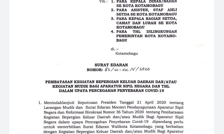 “Hal ini adalah menindaklanjuti Keputusan Presiden RI, tanggal 21 April 2020 tentang larangan mudik dan Edaran Menpan RB nomor 36 tahun 2020 tentang pembatasan kegiatan bepergian keluar daerah bagi ASN dan THL,” tulis Walikota Kotamobagu, dalam surat edarannya.