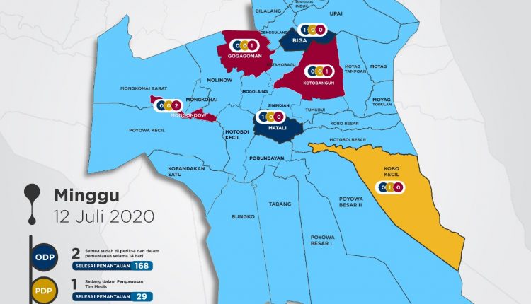 KOTAMOBAGU– Pemerintah Kota melalui Dinas Kesehatan (Dinkes) kembali merilis Peta Penyebaran Covid 19 di Kotamobagu, Selasa (12/07/2020).