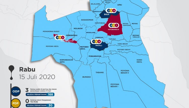 KOTAMOBAGU– Pemerintah Kota melalui Dinas Kesehatan (Dinkes) kembali merilis Peta Penyebaran Covid 19 di Kotamobagu, Rabu (15/07/2020).