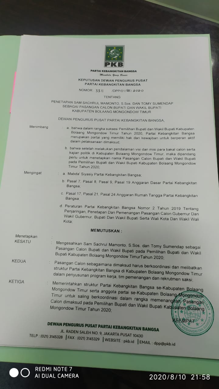 Dewan Pimpinan Pusat (DPP) Partai Kebangkitan Bangsa (PKB) akhirnya memberikan Surat Keputusan (SK) Calon Bupati Bolaang Mongondow Timur (Boltim) kepada Sam Sachrul Mamonto S.Sos dan calon Wakil Bupati Tomy Sumendap, Kamis (13/08/2020).