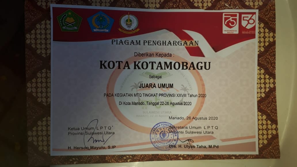 Seperti diketahui, pada MTQ ke – XXVIII Tingkat Provinsi Sulawesi Utara yang dilaksanakan di Kota Manado, pada 22 hingga 26 Agustus tersebut, Kontingen Kafilah Kota Kotamobagu berhasil meraih Juara Umum dari seluruh Kabupaten / Kota se – Provinsi Sulawesi Utara, dengan jumlah Poin 77. (adv)