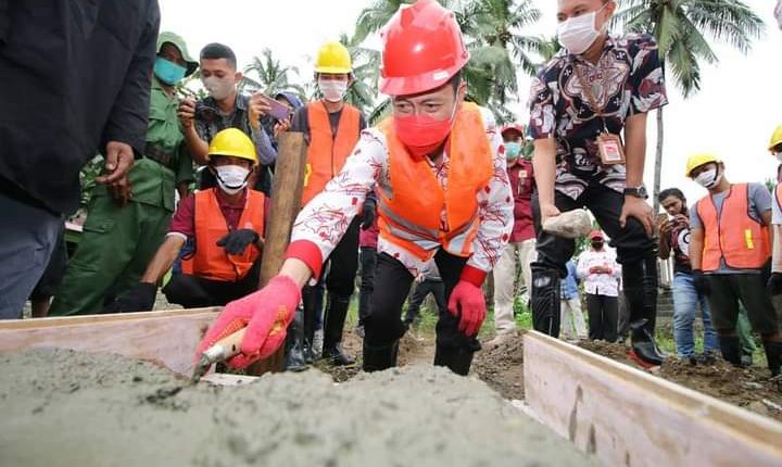 BOLSEL – Bupati Bolaang Mongondow Selatan Hi. Iskandar Kamaru S.Pt, didampingi Sekretaris Daerah, Marzanzius Arvan Ohy, S.STP, menghadiri sekaligus melakukan peletakan batu pertama program Kotaku (Kota Tanpa Kumuh), Kamis, (27/8/2020), berlangsung di Desa Ilomata, Kecamatan Pinolosian.