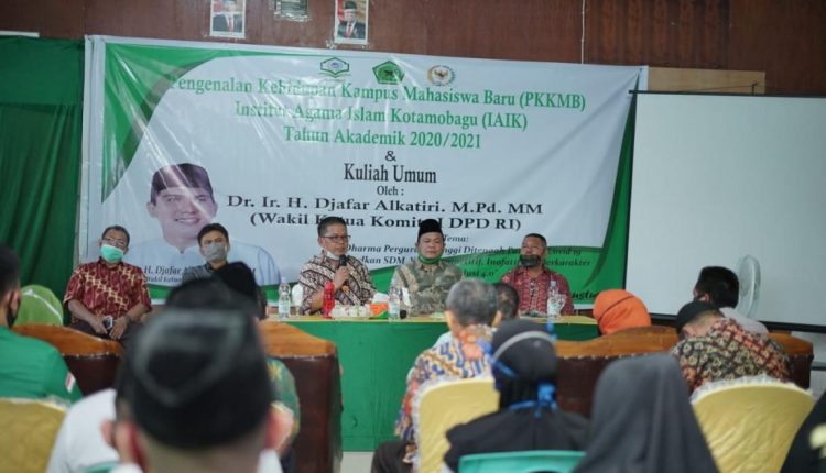 KOTAMOBAGU- Wakil Wali Kota (Wawali) Kotamobagu Nayodo Koerniawan, S.H., menghadiri penutupan kegiatan Pengenalan Kehidupan Kampus Mahasiswa Baru (PKKMB) Institut Agama Islam Kotamobagu (IAIK) tahun akademik 2020/2021, Bertempat di Aula Kampus IAIK Jalan Jhony Suhodo Kelurahan Kotobangon, Kecamatan Kotamobagu Timur,Sabtu (29/08) sore.