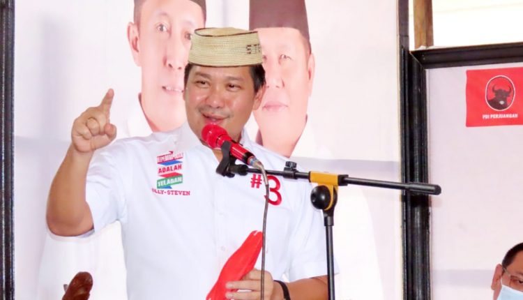 BOLSEL – Meski dalam kondisi pendemi Covid-19, kampanye calon Wakil Gubernur Sulawesi Utara (Sulut), Steven Kandow di Desa Momalia, Kecamatan Posigadan, Kabupaten Bolaang Mongondow Selatan (Bolsel) berlangsung meriah dengan tetap menerapkan protokol kesehatan Covid-19, Rabu (4/11/2020).
