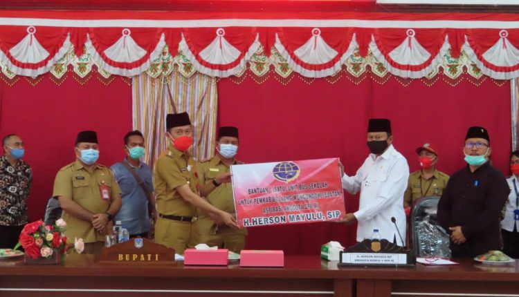BOLSEL – Anggota DPR RI, Hi Herson Mayulu menyerahkan satu unit Bus Sekolah kepada Pemerintah Kabupaten Bolaang Mongondow Selatan (Bolsel), serta Piagam Penghargaan dari Kementerian Desa kepada 33 desa terbaik dalam Penyaluran Bantuan Langsung Tunai Dana Desa (BLT DD) tahap pertama Tahun 2020.