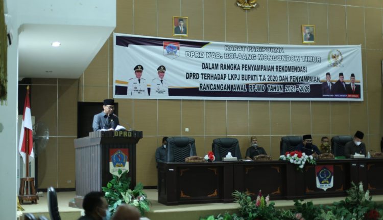 BOLTIM – Bupati Bolaang Mongondow Timur (Boltim) Sam Sachrul Mamonto S Sos, menghadiri Rapat Paripurna Dewan Perwakilan Rakyat Daerah (DPRD), dalam rangka penyampaian rancangan awal Rencana Pembangunan Jangka Menengah Daerah (RPJMD) Tahun 2021-2026, Selasa (27/04/2021), bertempat di ruang sidang Paripurna.