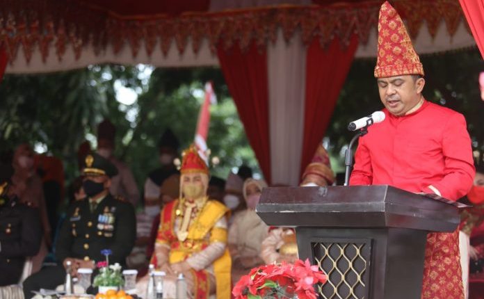 KOTAMOBAGU,DPRD- Ketua DPRD Kotamobagu Meiddy Makalalag membacakan secara singkat para upacara Hari Ulang Tahun (HUT) Ke-14 Kota Kotamobagu, di Alun-alun Boki Hotinimbang Lapangan Kotamobagu, Senin (24/5/2021).