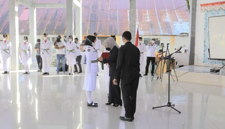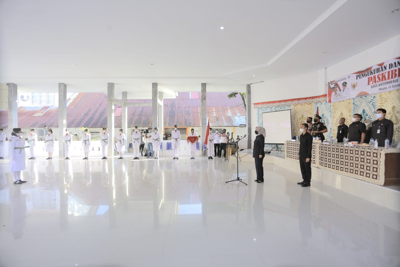 KOTAMOBAGU- Wali Kota Kotamobagu, Ir. Hj. Tatong Bara, mengukuhkan Paskibraka dan Duta Pancasila Kota Kotamobagu, di Aula kantor Wali Kota, Minggu (15/08/2021).