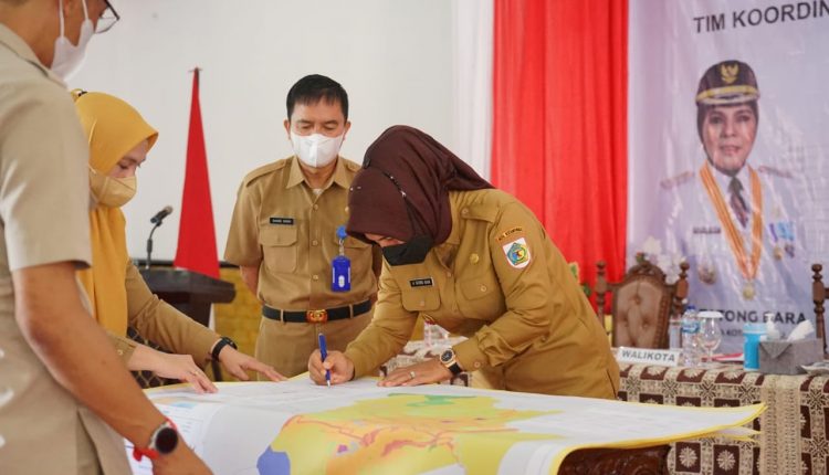 KOTAMOBAGU- Wali Kota Kotamobagu, Ir. Hj. Tatong Bara, menandatangani Peta Revisi Rencana Tata Ruang Wilayah (RTRW) Kota Kotamobagu Tahun 2014 – 2034, Senin (30/08/2021).