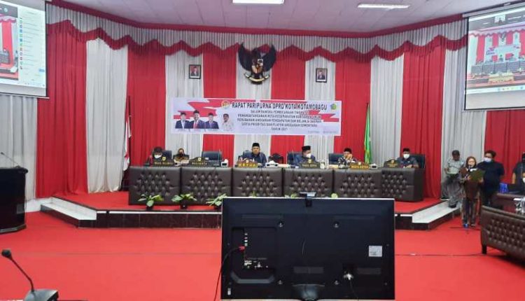 KOTAMOBAGU- Dewan Perwakilan Rakyat Daerah (DPRD) Kota Kotamobagu (KK) mengelar rapat paripurna dalam rangka pembicaraan tingkat II penandatanganan nota kesepakatan Kebijakan Umum Perubahan Anggaran Pendapatan dan Belanja Daerah Serta Prioritas dan Plafon Anggaran Sementara, Tahun 2021, Selasa (21/9/2021).