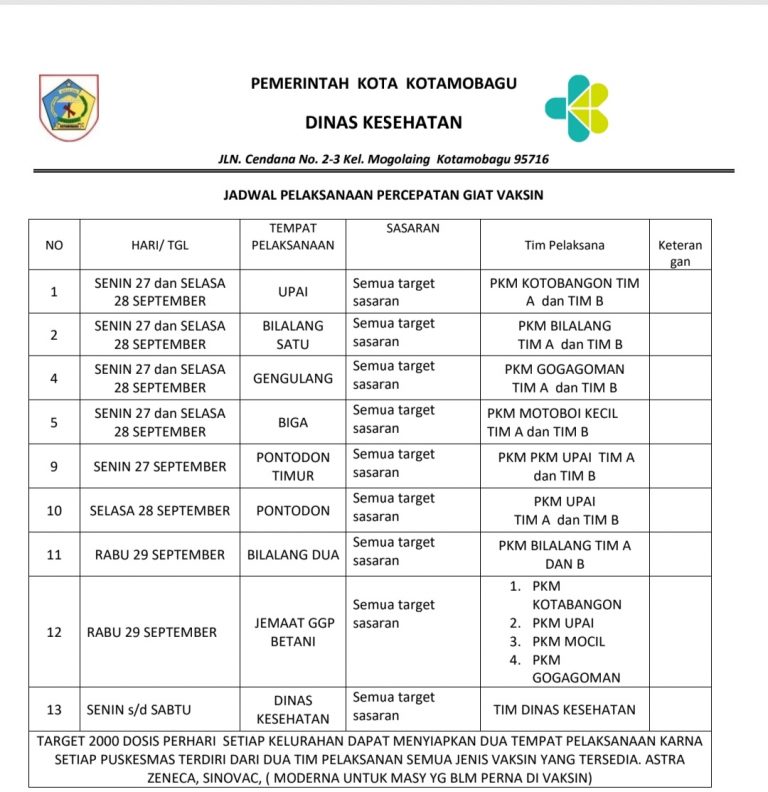Simak! Jadwal Lengkap dan Titik Lokasi Pelaksanaan Vaksinasi di Kotamobagu