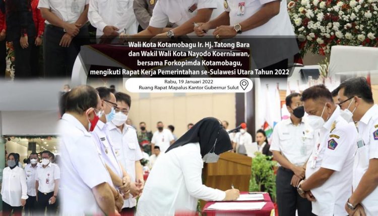 KOTAMOBAGU- Wali Kota Kotamobagu Ir Hj Tatong Bara bersama Wakil Walikota Nayodo Koerniawan SH mengikuti Rapat Kerja Pemerintahan tahun 2022 bersama Gubernur Sulut di Ruang Mapalus Kantor Gubernur, Rabu (19/01/2022).
