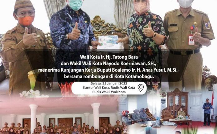 KOTAMOBAGU- Wali Kota Kotamobagu Ir Tatong Bara dan Wakil Wali Kota Nayodo Koerniawan SH, menerima kunjungan kerja Bupati Boalemo Provinsi Gorontalo bersama para jajaran Pemerintahannya, pada Selasa (25/1/22) bertempat di Ruang Kerja Wakil Wali Kota dan Rumah Dinas Wali Kota.