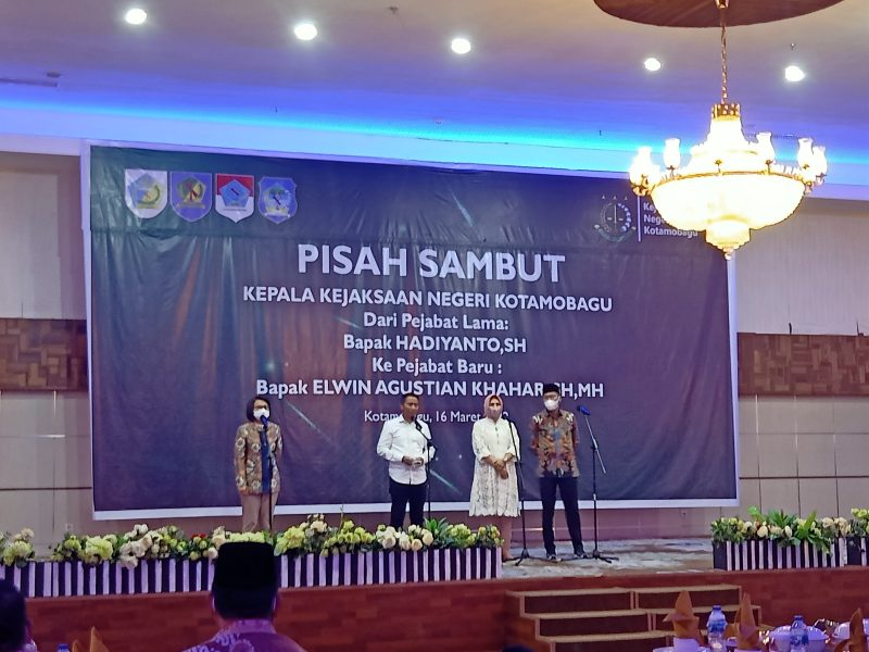 BOLTIM- Bupati Kabupaten Bolaang Mongondow Timur (Boltim) Sam Sachrul Mamonto S.Sos M.Si hadiri kegiatan pisah sambut Kepala Kejaksaan Negeri (Kajari) Kotamobagu dari pejabat pejabat lama Hadiyanto SH kepada pejabat baru Elwin Agustian Khahar SH MH pada Rabu, 16 Maret 2022.