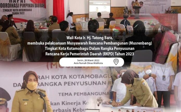 KOTAMOBAGU- Pemerintah Kota Kotamobagu menggelar Pelaksanaan Musyawarah Perencanaan Pembangunan atau Musrenbang dalam rangka penyusunan Rencana Kerja Pemerintah Daerah (RKPD) Tahun 2023, Kamis 31 MAret 2021 di rudis Wali Kota.