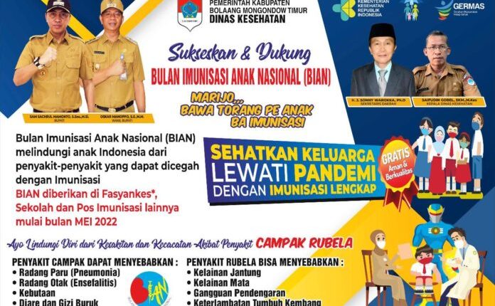 KOTAMOBAGU-Pemerintah Kabupaten (Pemkab) Bolaang Mongondow Timur akan turut serta menyelenggarakan Program nasional dalam rangka untuk mengejar kekurangan cakupan kesehatan nasional, yakni Bulan Imunisasi Anak Nasional (BIAN) mulai bulan Mei 2022.