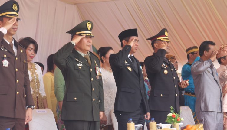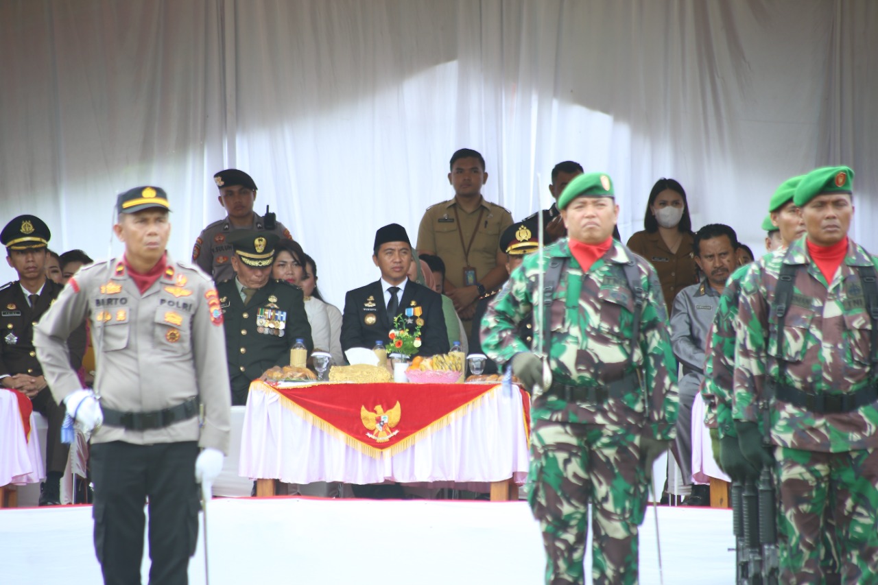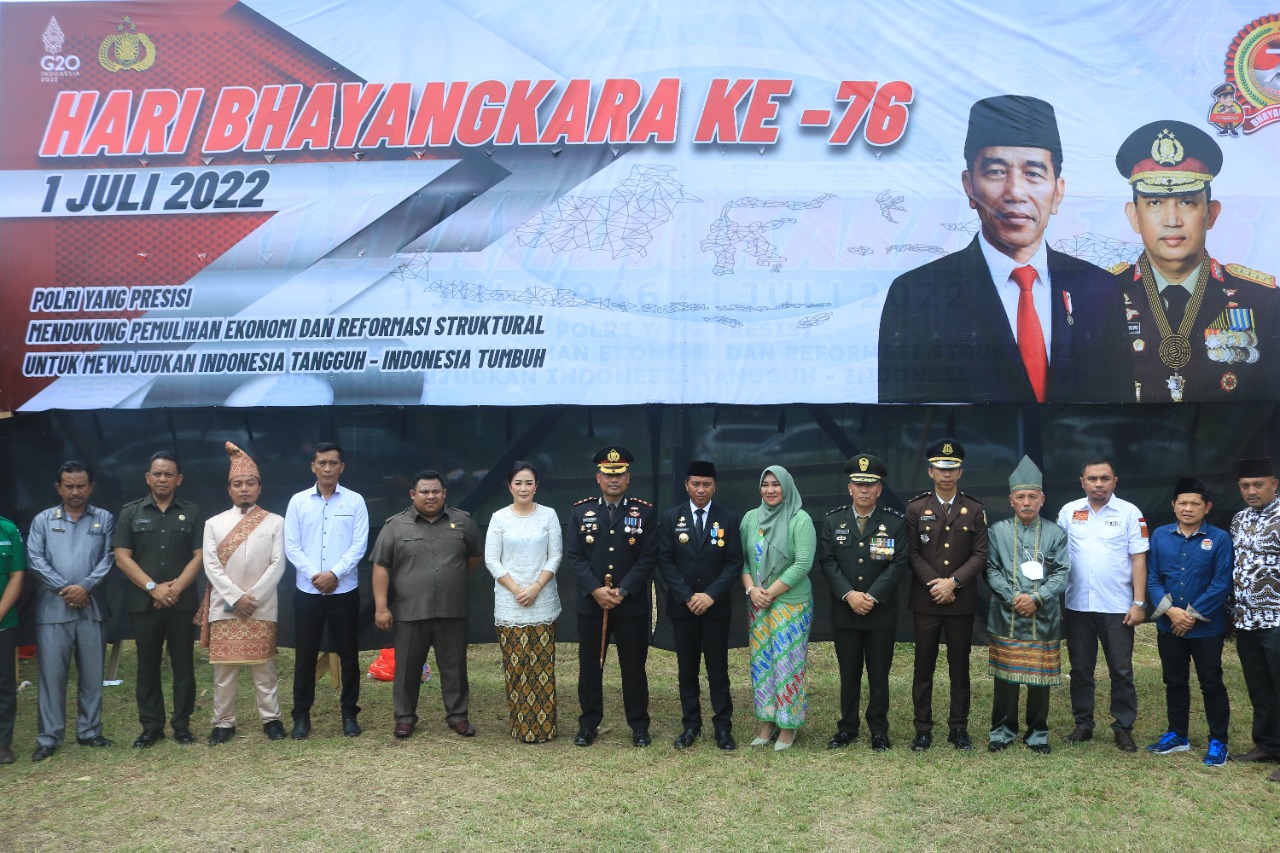 BOLTIM- Bupati Bolaang Mongondow Timur, Sam Sachrul Mamonto, S.Sos, M.Si didampingi ketua TP PKK, Ny Ervina Seska, S.Sos menghadiri upacara rangkaian peringatan Hari Ulang Tahun Ke-76 Bayangkara, Selasa, 5/7/202 yang diselenggarakan oleh Polres Bolmong Timur.