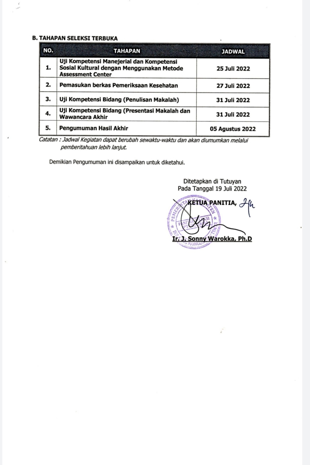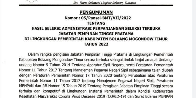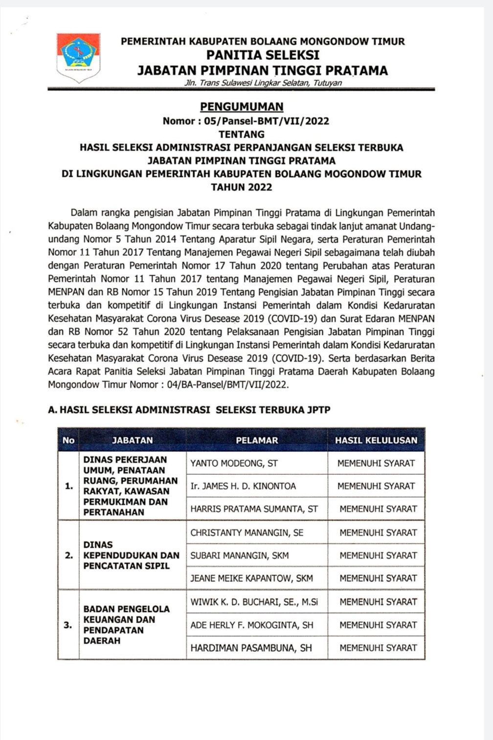 Pengumuman dengan Nomor: 05/Pansel-BMT/VII/2022 tertanggal 19 Juli 2022, tentang hasil seleksi administrasi perpanjangan seleksi terbuka JPTP di lingkungan Pemkab Boltim tahun 2022, ditandatangani oleh Sekretaris Daerah Boltim Sonny Warokka.