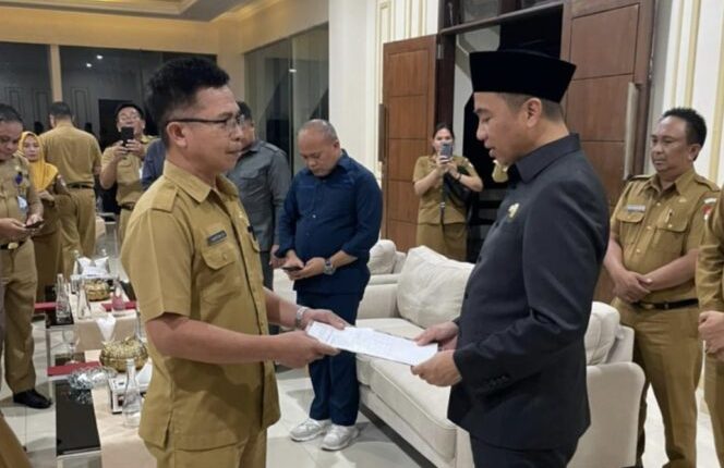BOLTIM- Bupati Kabupaten Bolaang Mongondow Timur (Boltim), Sam Sachrul Mamonto, menyerahkan Surat Keputusan (SK) Pelaksana Tugas (Plt) Kepala Dinas Perindustrian dan Perdagangan (Disperindag) Kepada Jantra Damopolii, di Ruang kerja Bupati, Selasa (9/8).