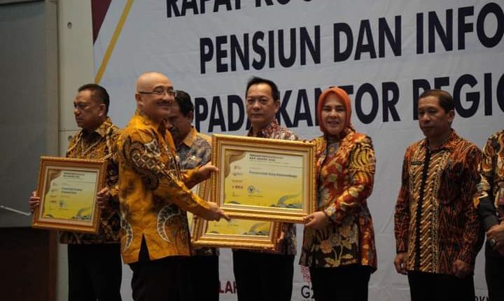 KOTAMOBAGU- Wali Kota Kotamobagu Ir Tatong Bara, menerima Penghargaan BKN Award Special Mention Pilot Project SIstem Informasi Aparatur Sipil Negara (SIASN) Tahun 2022, di sela acara Rapat Koordinasi dan Evaluasi Pelayanan Bidang Pensiun dan Informasi Kepegawaian Berbasis Digital, Rabu (12/10/2022).