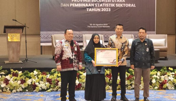 Penghargaan ini diserahkan Kepala BPS Provinsi Sulawesi Utara, Asim Saputra, SST., M. Ec. Dev., dalam kegiatan Rapat Pleno Evaluasi Penyelenggaraan Statistik Sektoral Provinsi Sulawesi Utara dan Pembinaan Statistik Sektoral Tahun 2023, di The Sentra Hotel Manado, Selasa (29/8/2023).