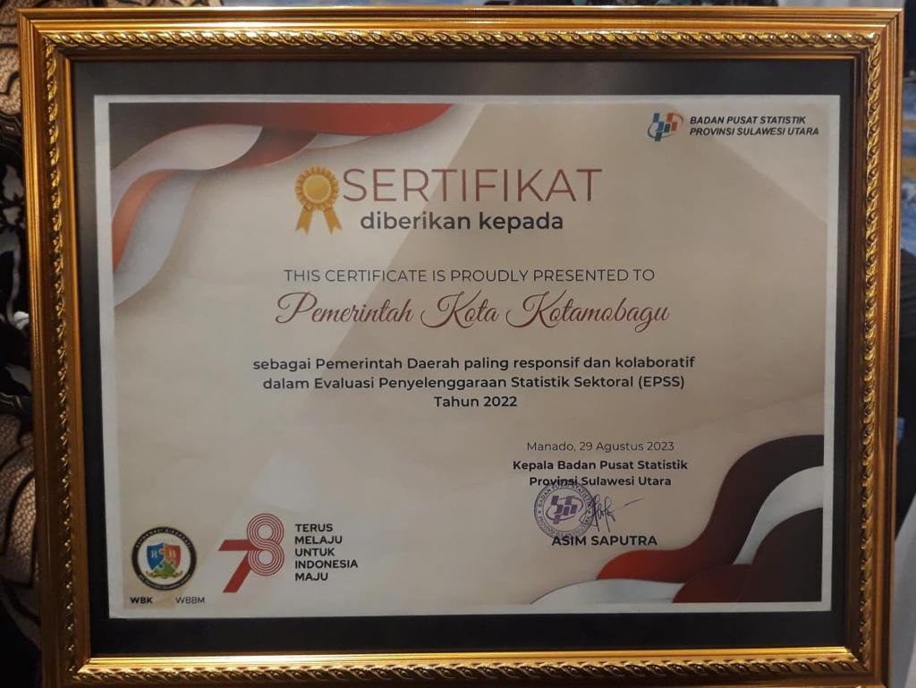 KOTAMOBAGU – Pemerintah Kota Kotamobagu meraih penghargaan dari Badan Pusat Statistik (BPS) Provinsi Sulawesi Utara sebagai Pemerintah Daerah Paling Responsif dan Kolaboratif dalam Evaluasi Penyelenggaraan Statistik Sektoral (EPSS) Tahun 2022.