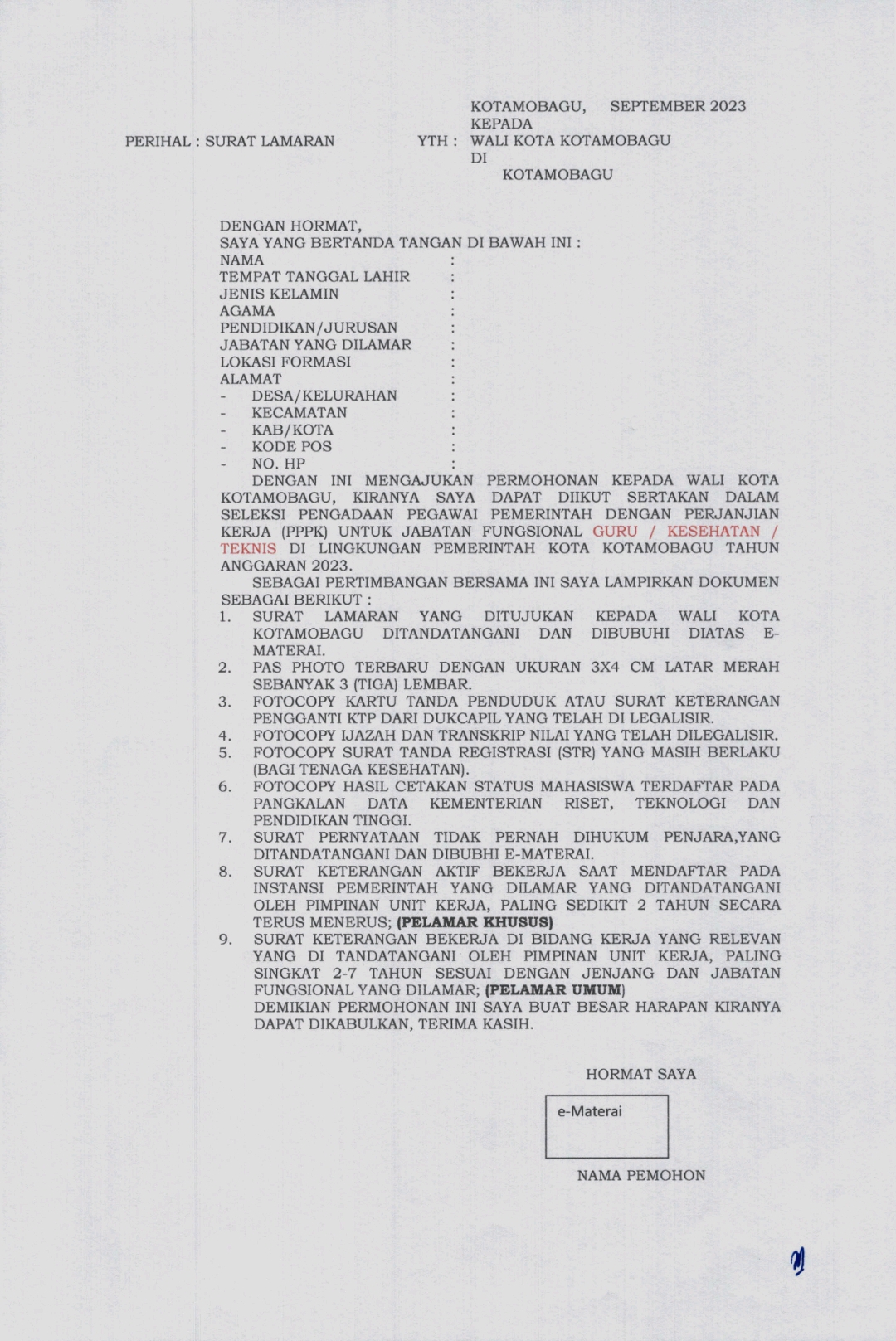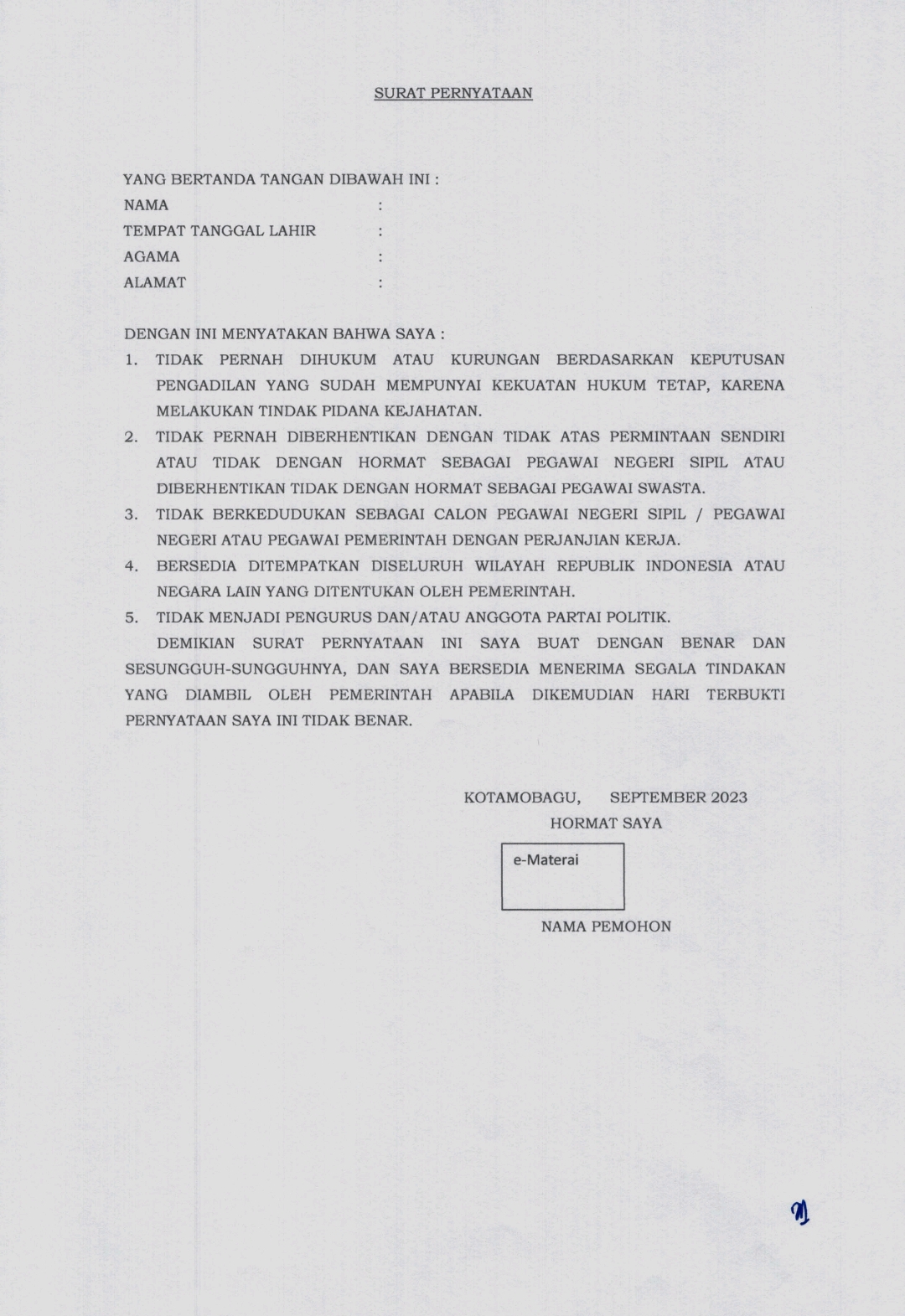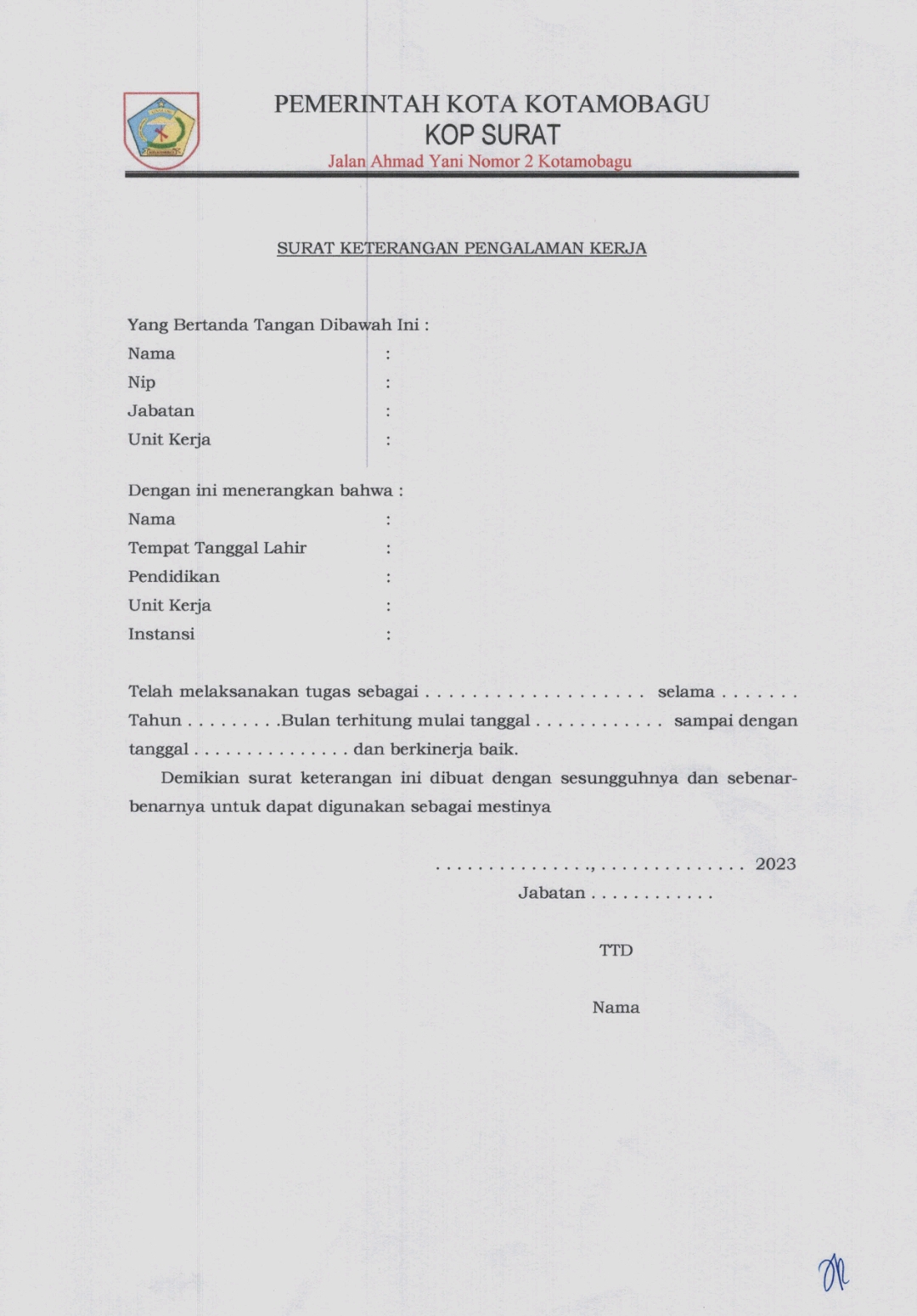 Berikut ini format lamaran, pernyataan dan surat pernyataan pengalaman kerja yang dikeluarkan oleh Pemkot Kotamobagu.