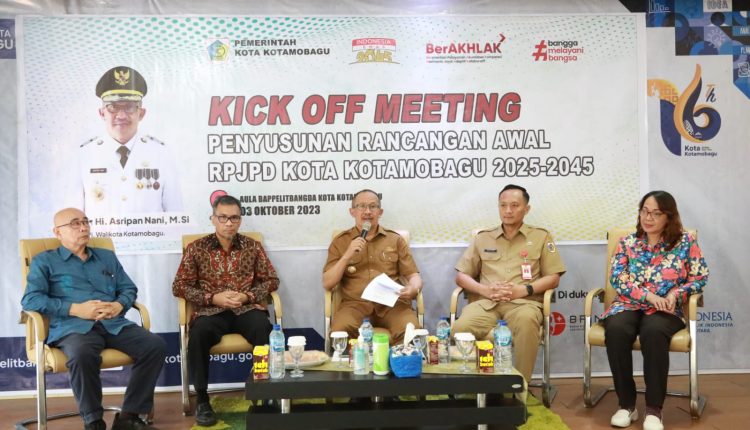 KOTAMOBAGU- Penjabat Wali Kota Dr. Drs. Hi. Asripan Nani, M.Si. membuka kegiatan Kick Off Meeting Penyusunan Rencana Pembangunan Jangka Menengah Daerah (RPJMD) Kota Kotamobagu Tahun 2025-2045, di Aula Bappeltibangda, Selasa 3 Oktober 2023.