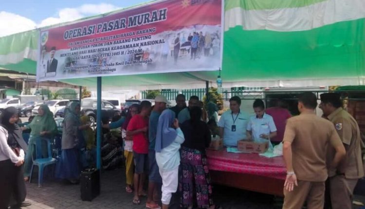 KOTAMOBAGU – Pemerintah Kota (Pemkot) Kotamobagu Dinas Perdagangan, Koperasi, Usaha Kecil dan Menengah menggelar pasar murah di bulan Ramadhan 1445 Hijiriah, di halaman masjid raya Baitul Makmur, Selasa 2 April 2024.