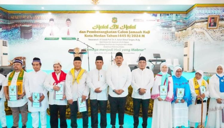 MEDAN – Calon Jemaah Haji asal Kota Medan dilepas kebarangkatannya oleh Wali Kota Medan Bobby Nasution sebanyak 2.482 orang di Gelanggang Mahasiswa Universitas Islam Negeri Sumatra Utara (UINSU), sekaligus halalbihalal bersama calon jemaah haji asal Kota Medan, Kamis (9/5/2024).