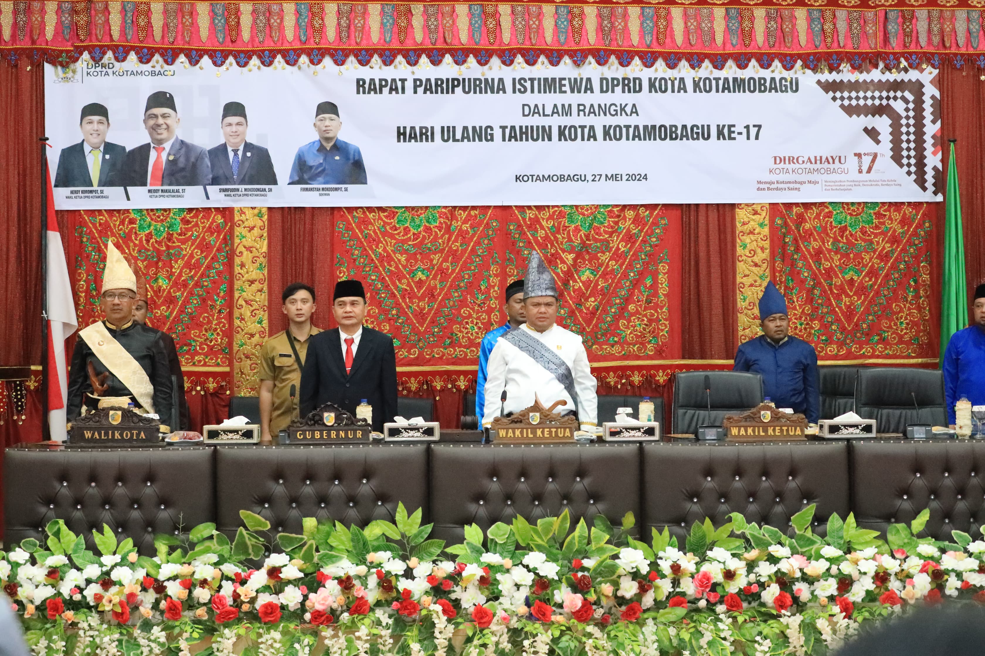 KOTAMOBAGU – Pj. Wali Kota Kotamobagu, Dr. Drs. Hi. Asripan Nani., M.Si, menghadiri Rapat Paripurna Istimewa DPRD Kota Kotamobagu dalam rangka Hari Ulang Tahun Kota Kotamobagu ke – 17 Tahun, Senin 27 Mei 2024.