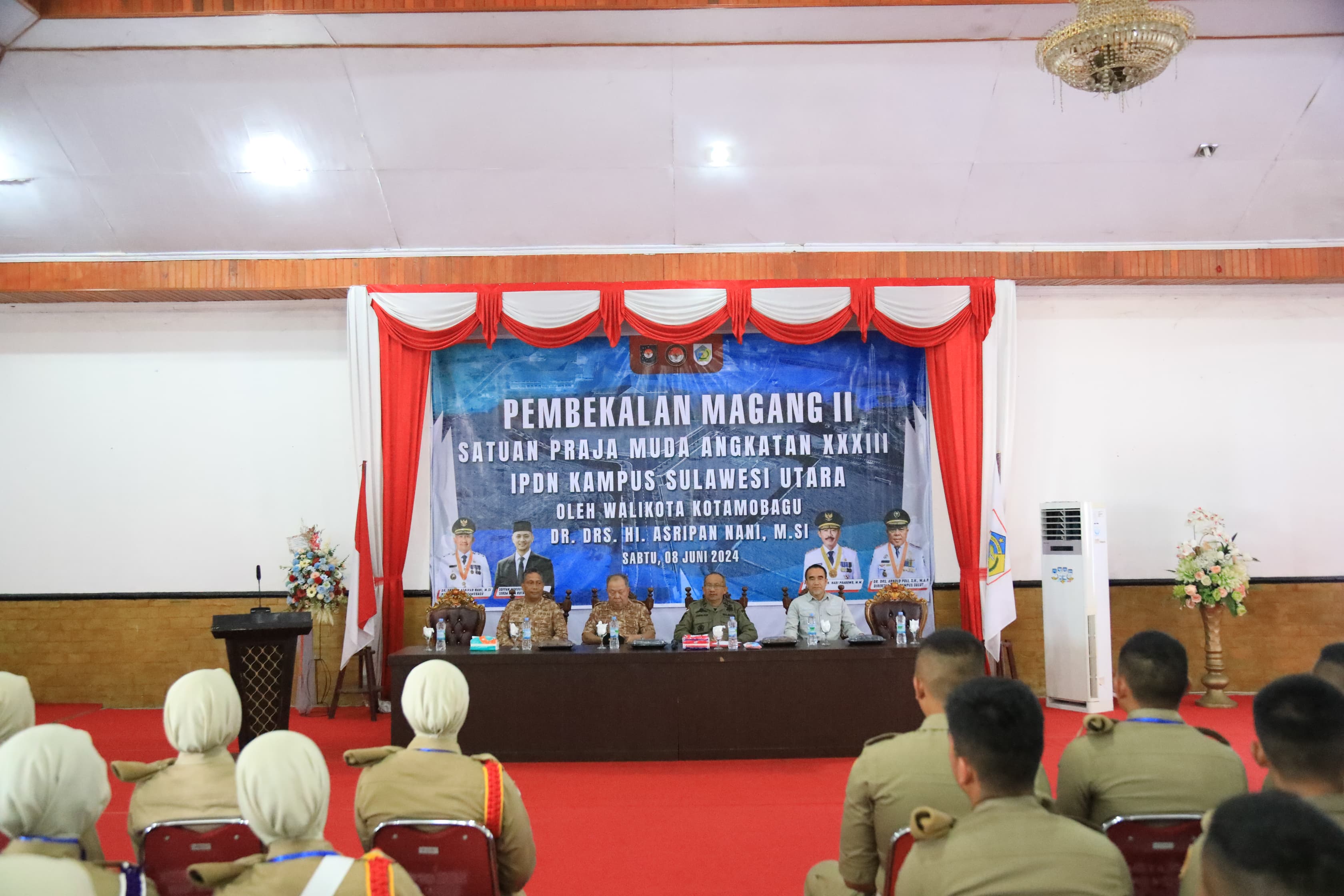 KOTAMOBAGU- Pj. Wali Kota, Dr. Drs. Hi. Asripan Nani., M.Si memberikan pembekalan kepada Peserta Magang II Satuan Praja Muda Angkatan XXXIII IPDN Kampus Sulawesi Utara dilingkungan Pemerintah Daerah Kota Kotamobagu, di aula Rumah Dinas Wali Kota, Sabtu 8 Juni 2024.
