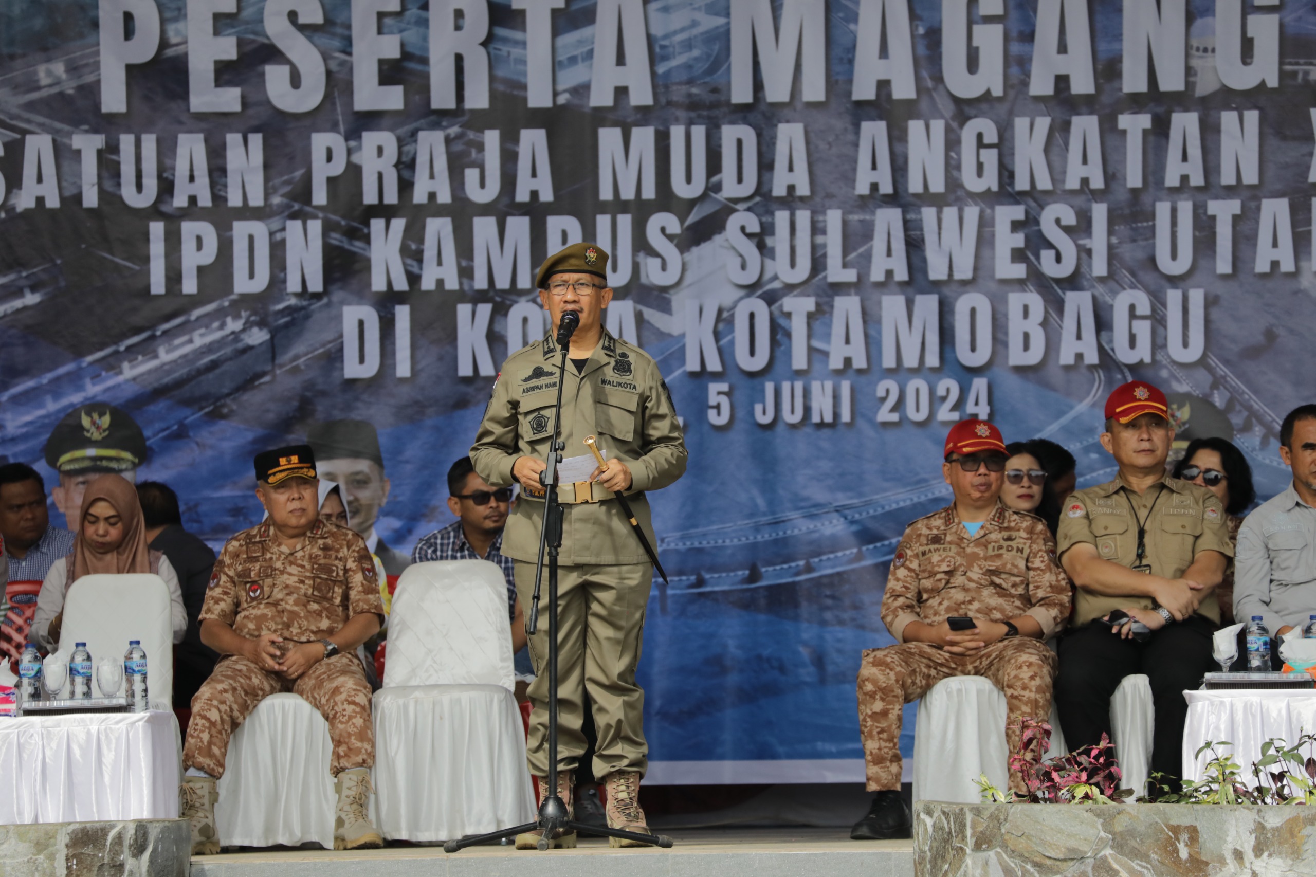 Turut hadir Kapolres Kotamobagu, AKBP. Dasveri Abdi., S.I.K., Wakapolres Kotamobagu, Kompol. Arie Prakoso., S.I.K., M.H., Direktur IPDN Kampus Sulawesi Utara, Dr. Drs. Arnold Poli., S.H., M.A.P., Sekretaris Daerah Kota Kotamobagu, Sofyan Mokoginta, S. H., M.E., Kepala Satuan Magang II Satuan Praja Muda Angkatan XXXIIII IPDN Kampus Sulawesi Utara, Arnold Ferdinan Bura., S.I.P., M.A.P., para Asisten, para Pimpinan Perangkat Daerah dan peserta Magang II Satuan Praja Muda Angkatan XXXIII IPDN Kampus Sulawesi Utara.