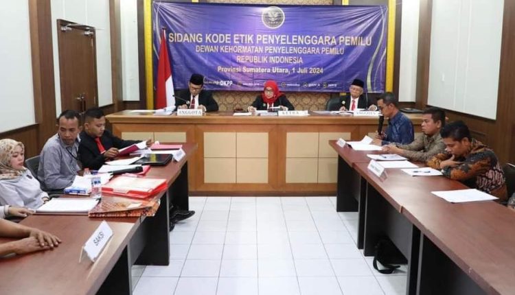 MEDAN – Dewan Kehormatan Penyelenggara Pemilu (DKPP) memeriksa Ketua KPU Labuhanbatu Selatan, Saiful Bahri Dalimunthe, terkait dugaan pelanggaran Kode Etik Penyelenggara Pemilu (KEPP) dalam Perkara Nomor: 77-PKE-DKPP/V/2024 yang di lakukan secara tertutup di kantor Bawaslu Provinsi Sumatra Utara, Senin (1/7/2024).