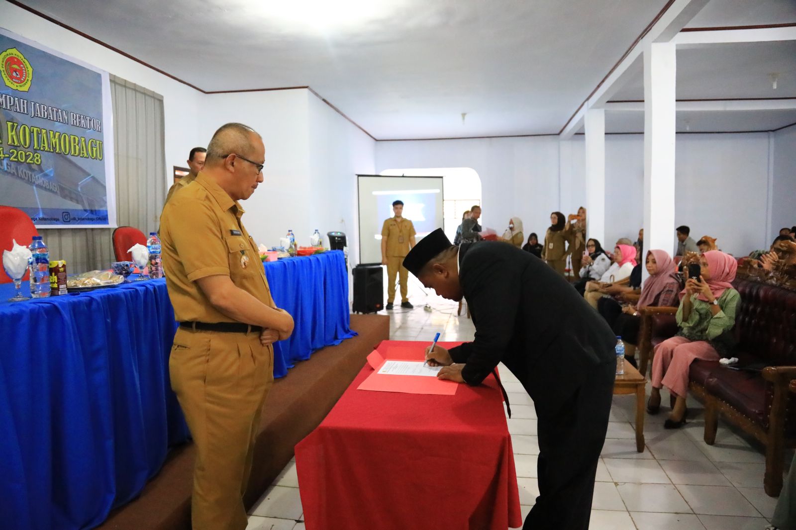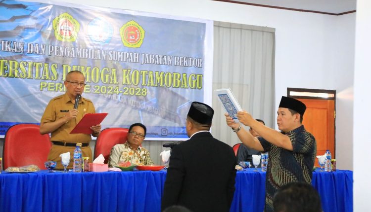 KOTAMOBAGU – Pj. Wali Kota Kotamobagu, Dr. Drs. Hi. Asripan Nani., M.Si Selaku Pembina Yayasan Pendidikan Kotamobagu Mandiri melantik Dr. Muharto., S.Pd.I., S.E., M.Si., sebagai Rektor Universitas Dumoga Kotamobagu (UDK) Masa Bakti 2024 – 2028, Senin 15 Juli 2024.