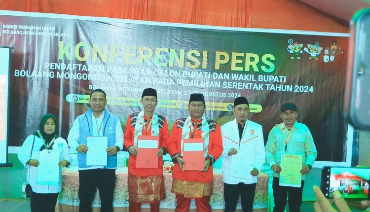 BOLSEL- Pasangan Calon Bupati Iskandar Kamaru dan Wakil Bupati Deddy Abdul Hamid, resmi mendaftar di Komisi Pemilihan Umum (KPU) Bolsel, pada kamis (29/8/2024). Mereka menjadi pasangan calon pertama yang mendaftar dalam Pilkada Bolsel tahun 2024.