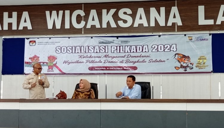 BENGKULU SELATAN – Bekerjasama dengan Serikat Media Siber Indonesia (SMSI) Provinsi Bengkulu, Komisi Pemilihan Umum (KPU) Bengkulu Selatan, menggelar kegiatan Sosialisasi Pilkada 2024 mengusung tema “Kolaborasi Mengawal Demokrasi, Wujudkan Pilkada Damai di Bengkulu Selatan” yang digelar di Aula Graha Wicaksana Laghawa, Polres Bengkulu Selatan, Rabu (09/10/2024).