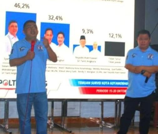 Dari foto yang tersebar terlihat sebuah layar yang menampilkan hasil survey tiga pasangan calon. Paslon nomor urut 1, Medy Makalalag dan Syarif Mokodongan, atau yang dikenal dengan nama “MESRA” berada di depan layar.
