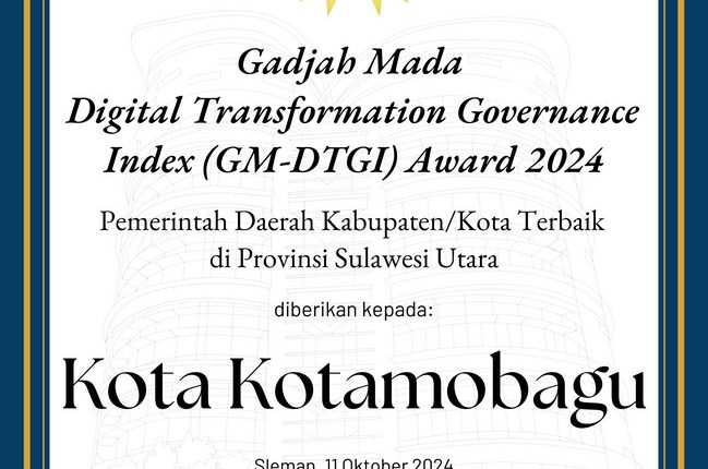 KOTAMOBAGU- Pemerintah Kota Kotamobagu menerima penghargaan sebagai Pemerintah Daerah Terbaik di Provinsi Sulawesi Utara pada ajang Gadjah Mada Digital Transformation Governance Index (GM-DTGI) Award tahun 2024, yang dilaksanakan Pusat Kajian Sistem Informasi (PKSI) Fakultas Ekonomi dan Bisnis (FEB) Universitas Gadjah Mada Yogyakarta, pada Oktober lalu.