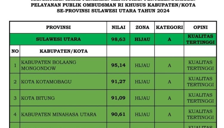 KOTAMOBAGU- Pemerintah Kota (Pemkot) Kotamobagu meraih prestasi membanggakan, atas Penilaian Kepatuhan Penyelenggaraan Pelayanan Publik tahun 2024 dengan nilai 91.27 Zona Hijau, Kategori A dan Opini Kualitas Tertinggi yang diberikan oleh Ombudsman Republik Indonesia.