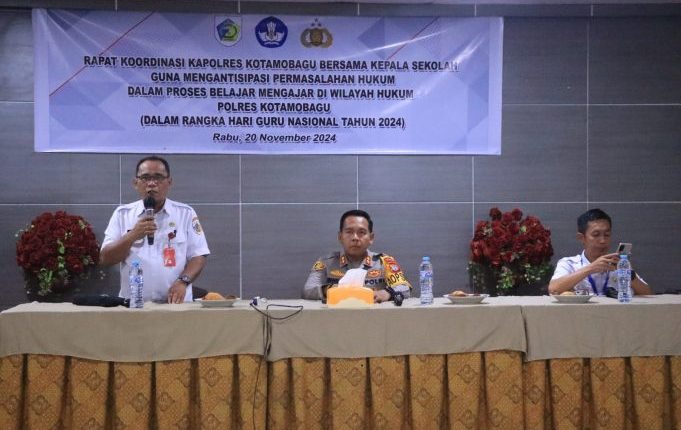 KOTAMOBAGU- Dalam rangka Hari Guru Nasional tahun 2024, Dinas Pendidikan Kota Kotamobagu menyelenggarakan Rapat Koordinasi bersama Kapolres Kotamobagu, AKBP Irwanto SIK MH, dan para kepala SD dan SMP se-Kotamobagu, yang berlangsung di Hotel Senator Kotamobagu, Rabu 20 November 2024.
