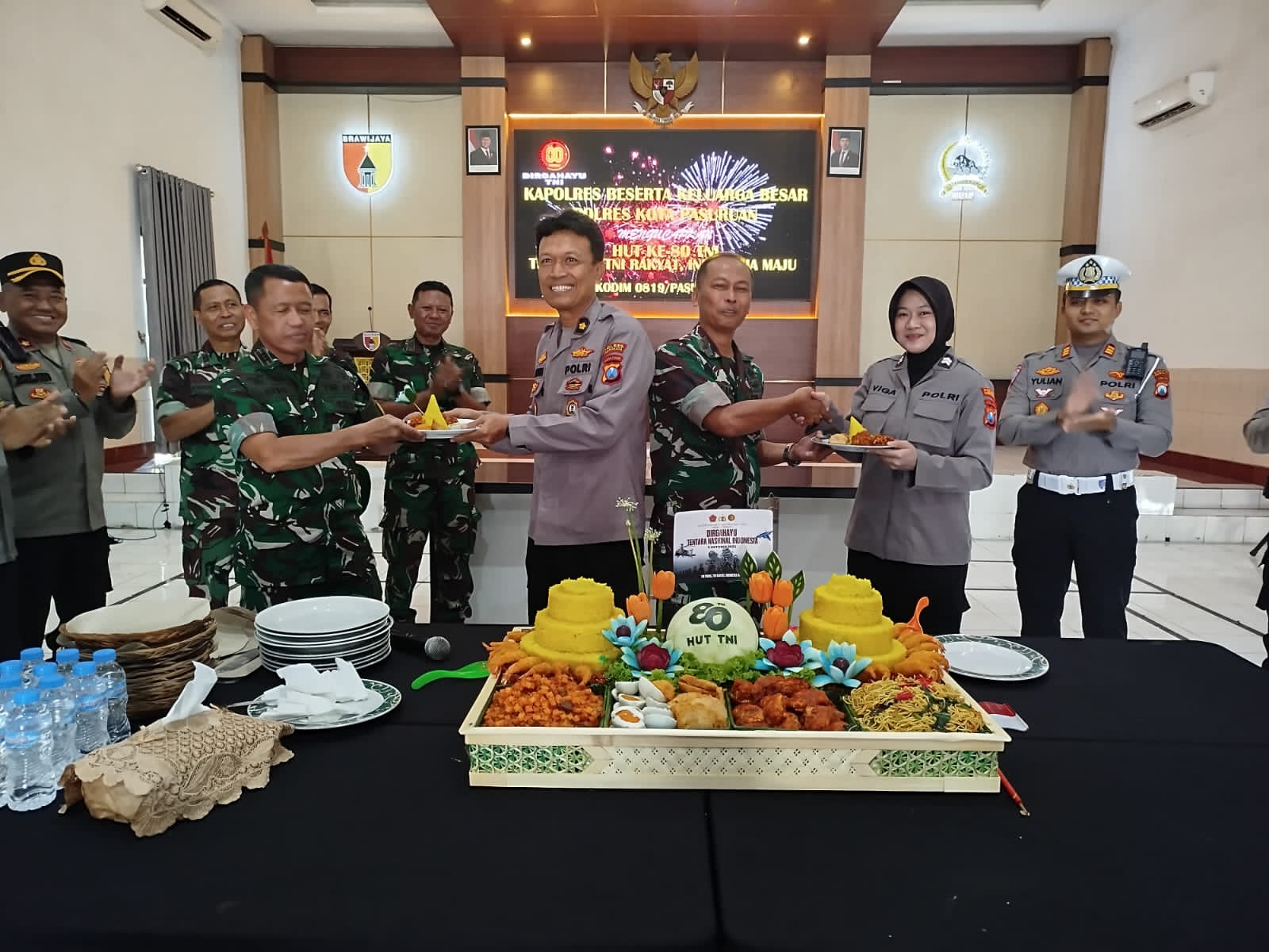 Polres Kota dan Kabupaten Beri Kejutan Tumpeng HUT ke-80 TNI di Makodim 0819/Pasuruan