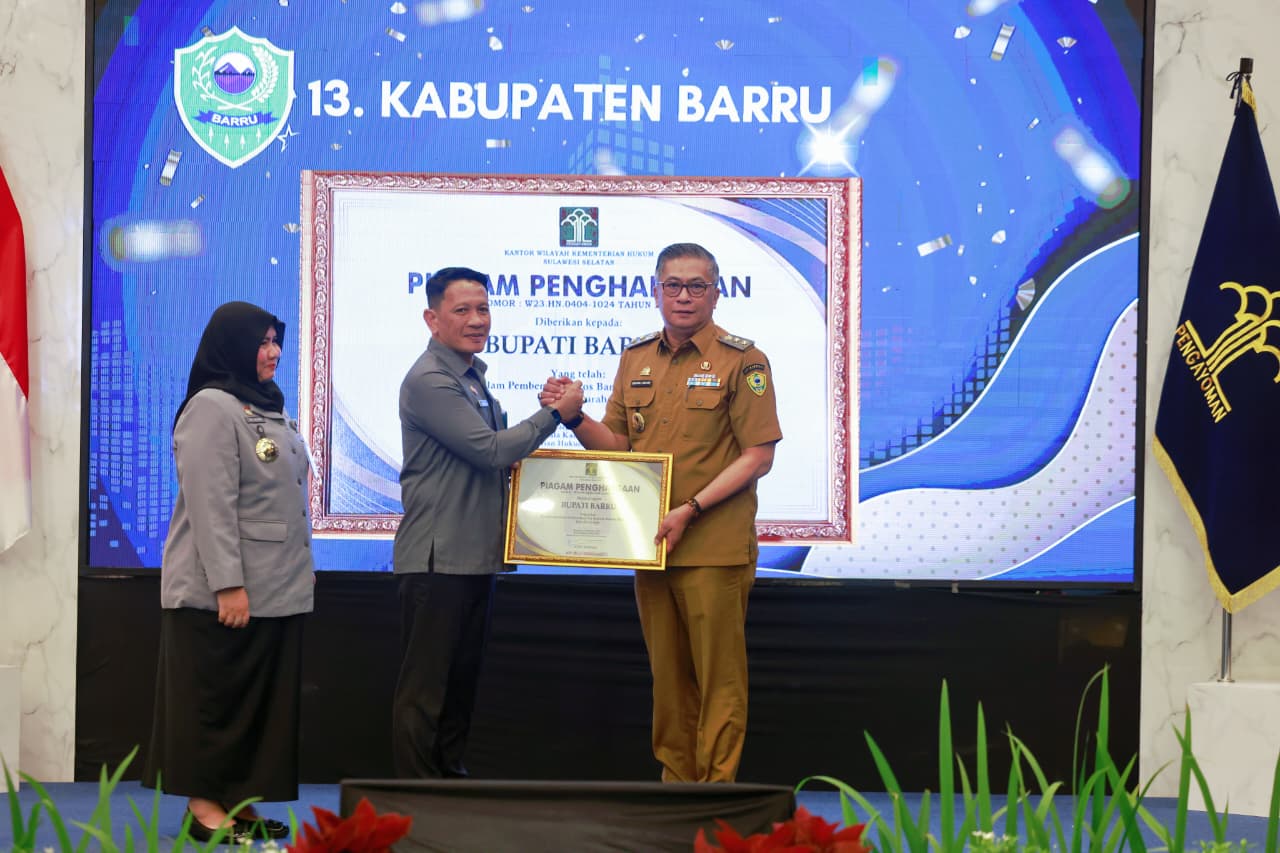 Diketahui, Kanwil Kemenkum mengapresiasi langsung dengan Piagam Penghargaan kepada Pemerintah Kabupaten Barru dan 7 Pemerintah Kabupaten/Kota lainnya se-Sulsel.