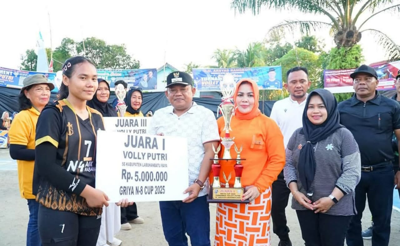 LABUHANBATU – Wakil Bupati Labuhanbatu H. Jamri ST bersama Ketua TP-PKK Ny. Hj. Wan Juma Sari Dewi Jamri menutup Turnamen Bola Voli Putri Griya Cup 2025 di Desa N-8, Kecamatan Bilah Hulu, Minggu (26/10/2025).