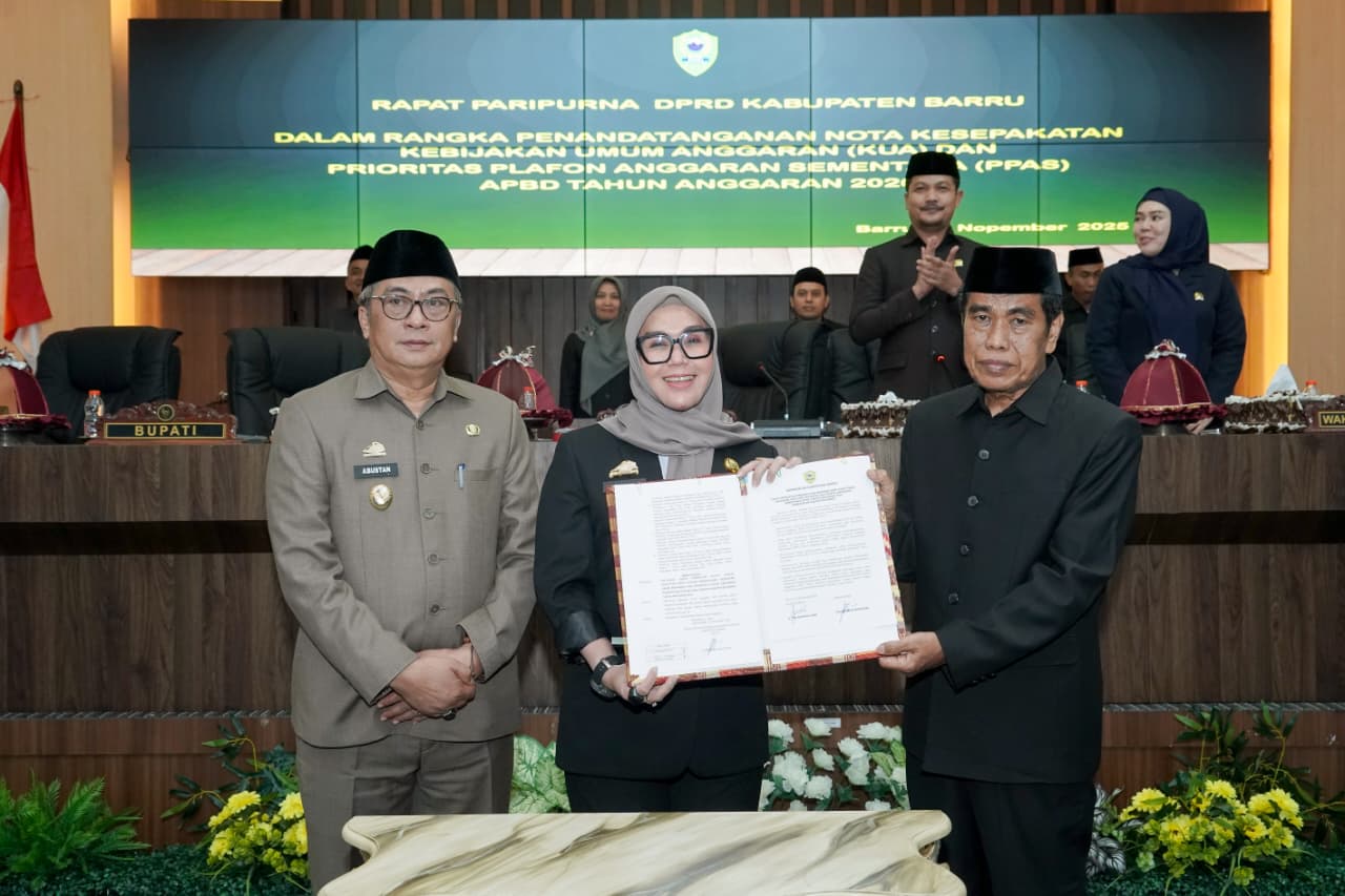Barru — Bupati Barru, Andi Ina Kartika Sari, menghadiri Rapat Paripurna DPRD Kabupaten Barru dengan agenda Penandatanganan Nota Kesepakatan Kebijakan Umum Anggaran (KUA) dan Prioritas Plafon Anggaran Sementara (PPAS) Tahun Anggaran 2026, Senin malam (24/11/2025