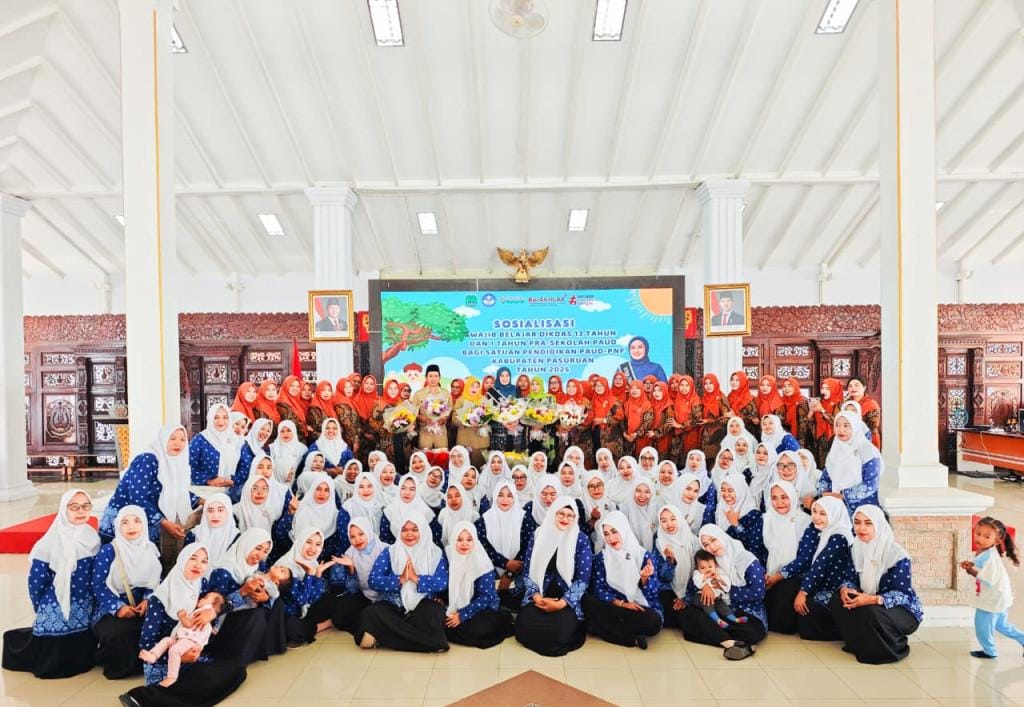 PASURUAN – JATIM || Dinas Pendidikan dan Kebudayaan Kabupaten Pasuruan menggelar sosialisasi Wajib Belajar Pendidikan Dasar 13 Tahun serta 1 Tahun Pra Sekolah PAUD, Senin (29/12/2025). Kegiatan tersebut berlangsung di Pendopo Nyawiji Ngesti Wenganing Gusti dan dibuka langsung oleh Bunda PAUD Kabupaten Pasuruan, Merita Rusdi Sutejo.