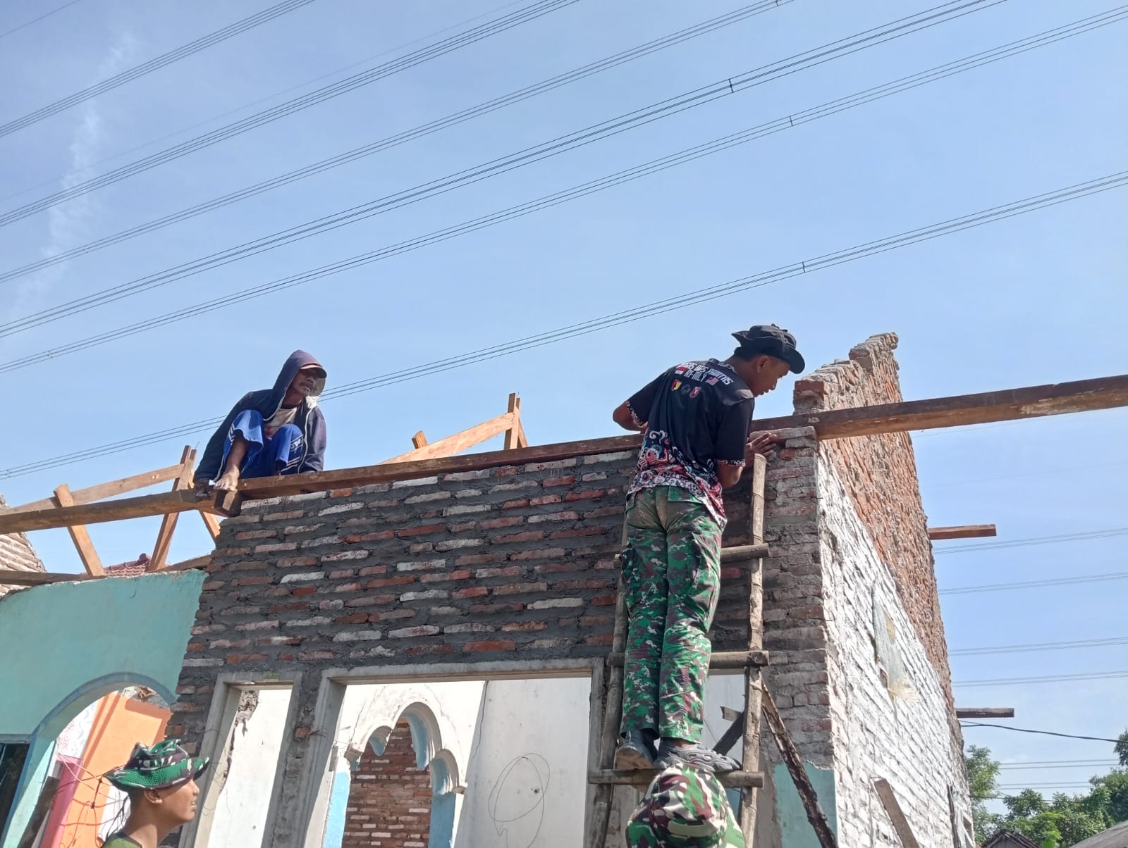 Tahapan pengerjaan kini memasuki pemasangan balok kayu sebagai rangka utama bagian atas bangunan. Anggota Satgas TMMD bersama warga setempat terlihat kompak bekerja bahu-membahu menyelesaikan struktur penopang atap rumah tersebut. Meski di bawah terik matahari, semangat gotong royong tetap terasa kuat demi mempercepat proses pembangunan.