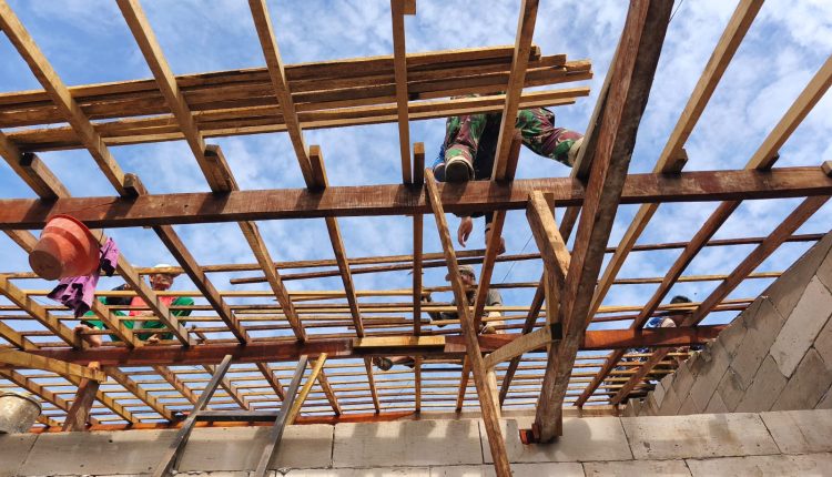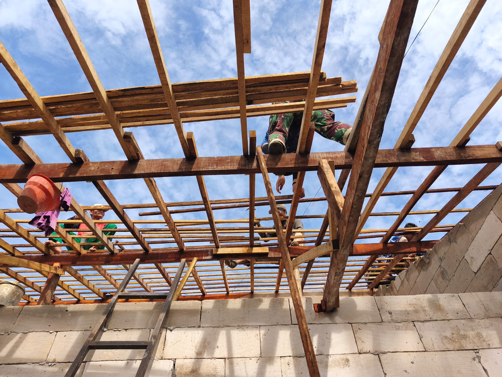 Memasuki tahap lanjutan, personel Satgas TMMD mulai memasang rangka atap berbahan kayu. Pengerjaan dilakukan secara gotong royong dan penuh ketelitian agar konstruksi atap kuat, kokoh, serta aman untuk jangka panjang.