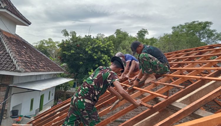 Memasuki tahap pemasangan atap, Satgas TMMD bersama warga bahu-membahu menyelesaikan pengerjaan rumah milik Zainal Abidin di Dusun Ngepreng RT 03/RW 03, Desa Wonosari, Kecamatan Gondangwetan, Kabupaten Pasuruan, Jawa Timur, Rabu (4/3/2026).